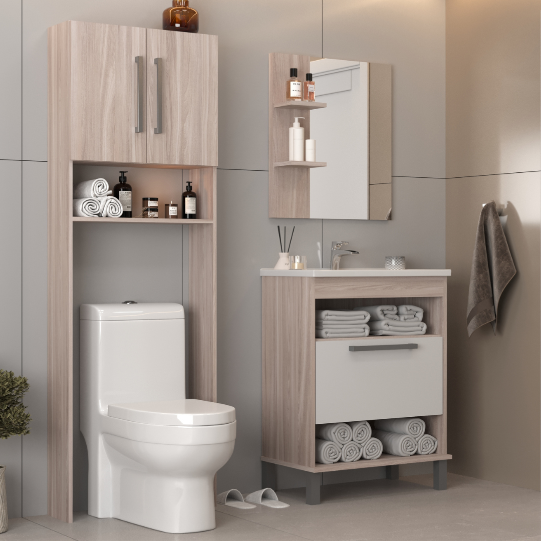 Funcional combo para baño, en colores Beige Malbec y Blanco, compuesto por un mueble con una puerta y dos nichos y un organizador que cuenta con dos puertas, una repisa interna y una externa. Todos excelentes espacios que te permitirán mantener tus objetos ordenados.