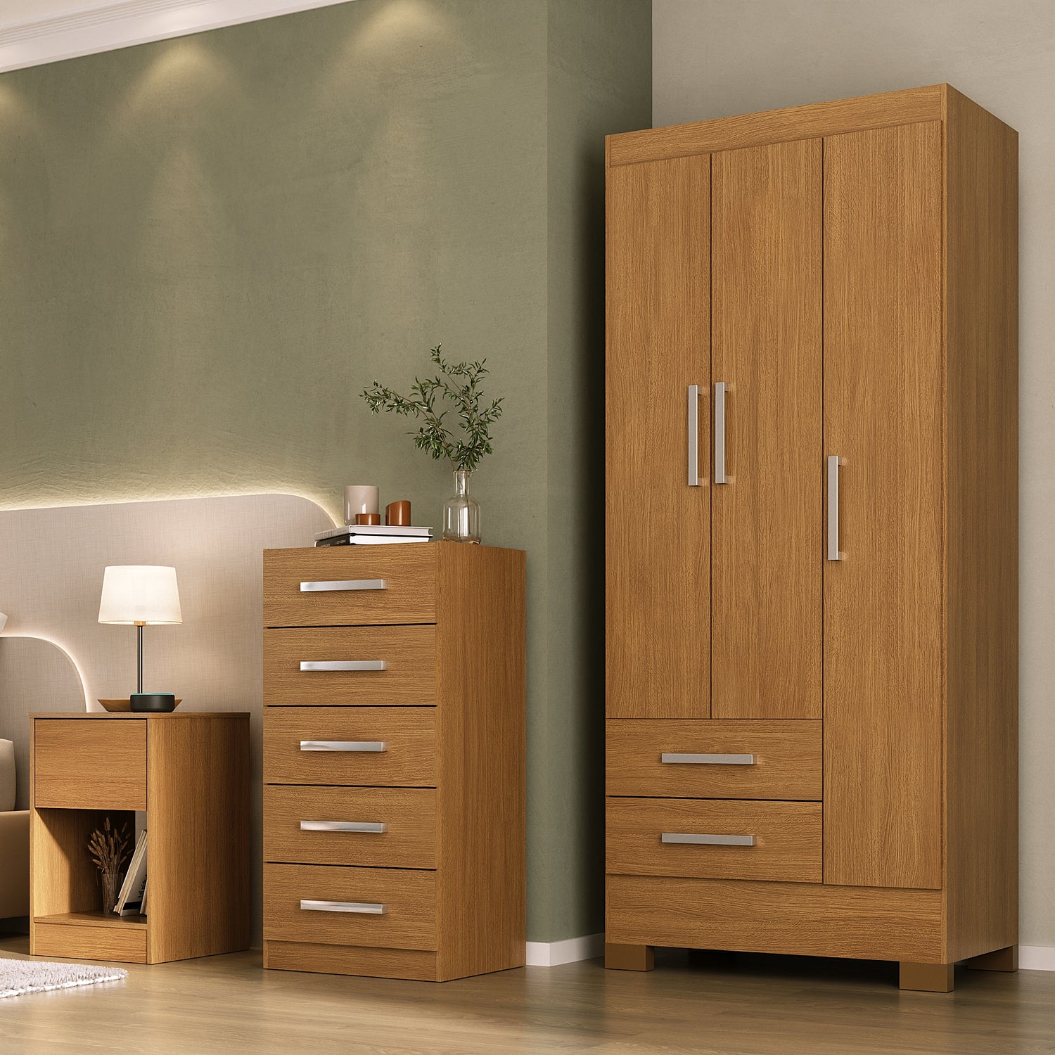 Funcional combo en color canela, compuesto por un closet, una cómoda y un velador. El closet tiene 3 puertas y 2 cajones. Podrás aprovechar los nichos que hay en su interior y el espacio de colgado para mantener tus objetos ordenados. La cómoda cuenta con 5 cajones, y el velador 1 nicho y 1 cajón, todos muy buenos espacios de guardado.
